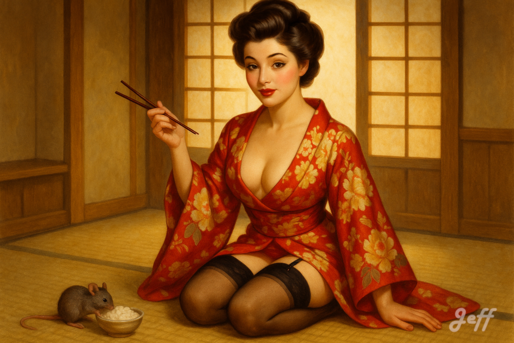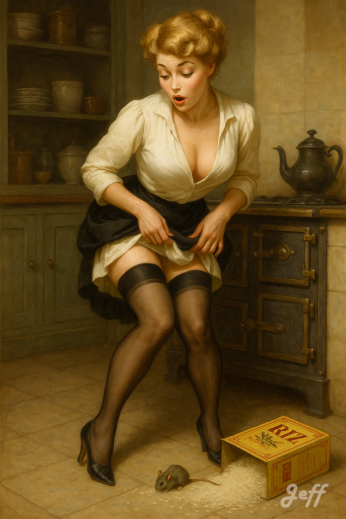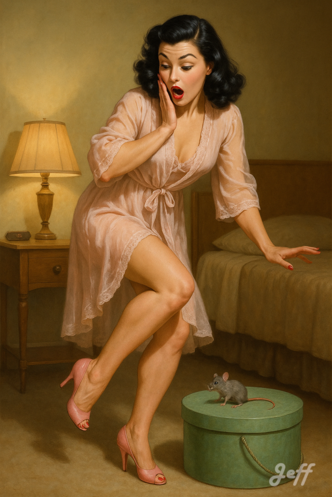 Le genre pin-up est fondé sur la mise en scène d’une femme séduisante, glamour et souvent très confiante. L’introduction d’un élément minuscule et inoffensif (une souris) qui la fait hurler ou monter sur une chaise crée un contraste humoristique puissant. Cela rend l’image à la fois sexy (la pin-up est souvent dans une pose dynamique ou avec sa tenue légèrement dérangée) et dérisoire, soulignant son côté « humain » et vulnérable.