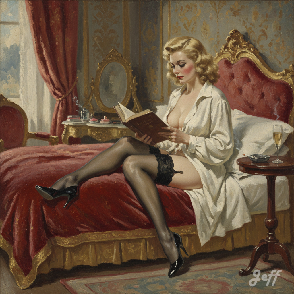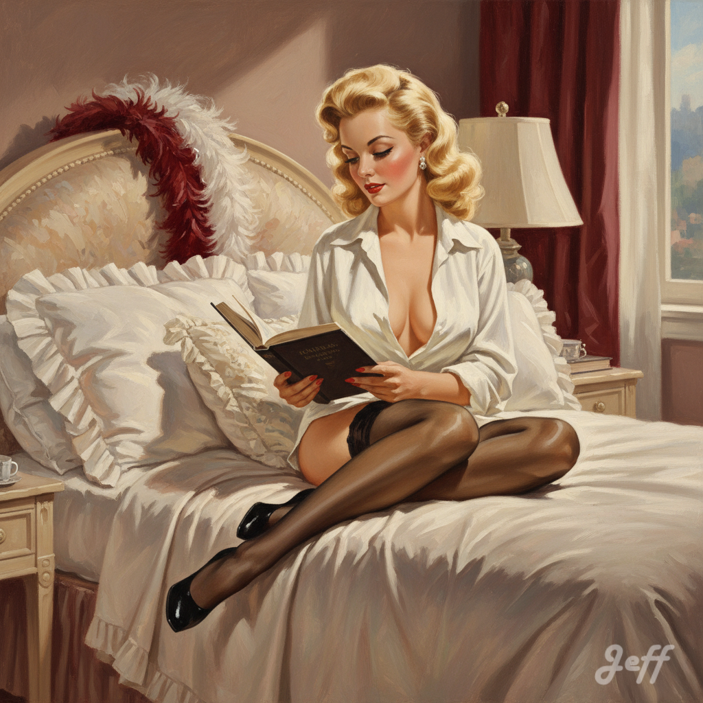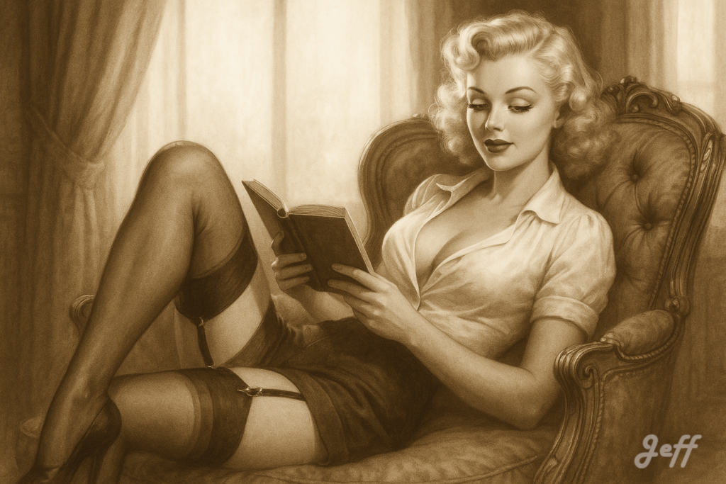 Lorsque l’image de la pin-up est associée à la lecture, elle apporte une nuance d’intellectualisme ou d’intimité. Cela peut servir à humaniser le personnage, le montrer dans une posture de loisir plus ordinaire ou cultivée, tout en conservant son attrait visuel.
